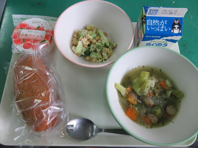 今日は、サラダにキャベツが入っていました。今日はキャベツのお話です。キャベツを育てるのに適した温度は、15度から20度で、暑さを嫌う野菜なので、南から北へ、平地から高原へと、日本の国土を生かして「産地リレー」が行われています。今日のキャベツは、二小校区の堀さんが作られた冬キャベツでした。ありがとうございました