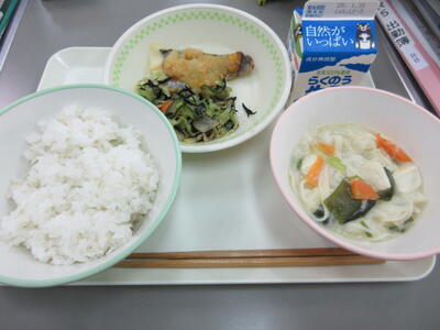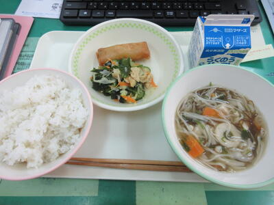 今日は、平成18年の再現メニューでした。このころから、給食が「食育」の教材となり、日本の料理だけでなく、色々な国の料理も出るようになったそうです。今日は、キムチチャーハン、チーズ春巻き中華風じゃこサラダ、デザートは杏仁豆腐でした。今日もおいしくいただきました。