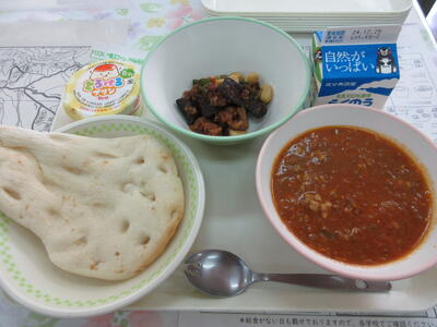 今日は、キーマカレーとナンでした。キーマカレーは、ひき肉を使ったカレーです。今日もおいしくいただきました。