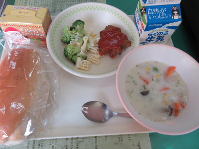 今日は、給食センターのトラブルですまし汁がありませんでした。今年最後の給食、おいしくいただきました。
