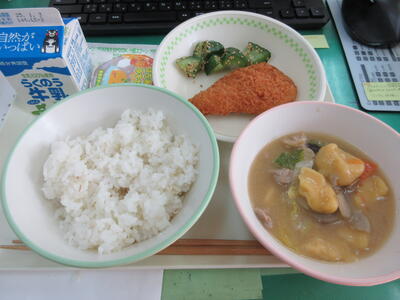今日は、ふるさとくまさんデーでした。宇城地区の伝統的な料理、びりん飯、レンコンチップがありました。びりん飯は、具だくさんでおいしかったです。