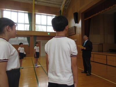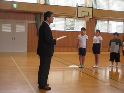 応援団のリーダーは、4、5、6年生それぞれ2人ずつ。結団式に先立って、リーダーには、南関第三小学校のリーダーとして期待していることを話しました。一つ目は、日常生活の大切さで、日常生活でリーダーとして認められることが、みんなを引っ張ることにつながることを話しました。二つ目は、運動会だけでなく、運動会後も南関三小のリーダーとして、学校を今年1年間よいよい方向に引っ張ってほしいことを伝えました。