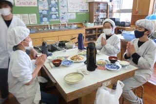 手を合わせて、いただきます! 自分たちの力で準備し、作り上げた料理は格別においしいですね。子どもたちは、片付けまできっちりがんばりました。