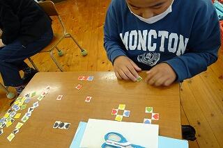 図工?算数?正解は、外国語の時間です。外国語の時間は、楽しいゲームがたくさんです。今週は、カードを切り取り、「レッドスター」「イエローサークル」など、色と形を発音しながら、形を作ったり、カード交換をしたりしました。