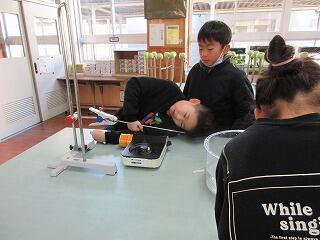 4年生理科「もののあたたまりかた」の学習では、金属、水、空気はどのように温まるのか調べました。この日は、金属の棒にろうを塗り、ガスコンロの炎をあてて、どこからろうが溶けるか実験をしました。