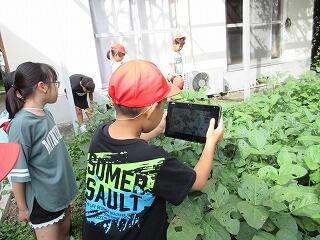 大豆畑で大豆の成長を観察しました。今日のテーマは、いつもの大豆の成長の観察に加えて、大豆についている虫を写真に撮ろうでした。
