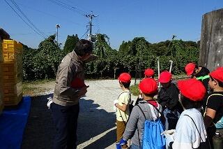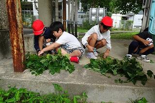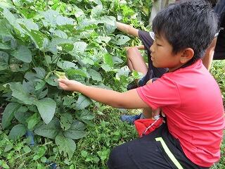 子どもたちは、枝豆の数を数えたり、葉の様子を観察したり、虫を見つけたりと観察を楽しんでいました。脱皮したばかりのバッタとその抜け殻も見つけて、喜んでいました。