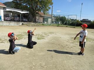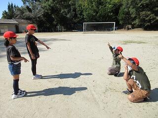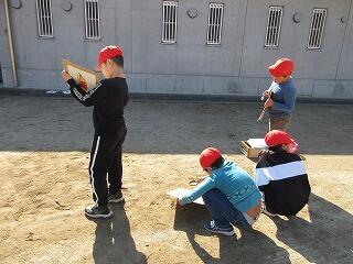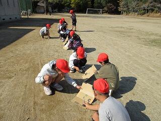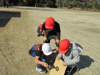 3年生の理科では、太陽と影の向きや、太陽の動きについての学習をしています。この日は、太陽の向きと影の向きを観察しました。