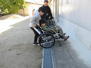 段差を上る体験もしました。車椅子の下のレバーを足で踏み、車椅子を持ち上げながら前に押すのは、とても難しそうでした。何回も練習してできるようになりました。