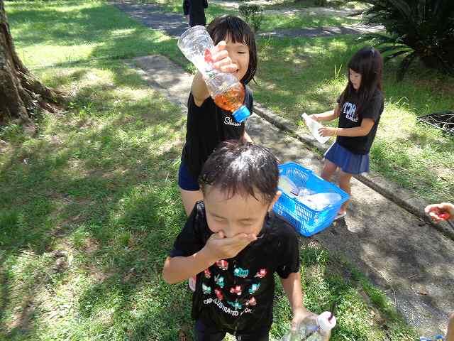 手作りの水鉄砲やマヨネーズの空き容器などを使用し、お互いに水をかけ合いながら残暑を涼しく過ごしました。