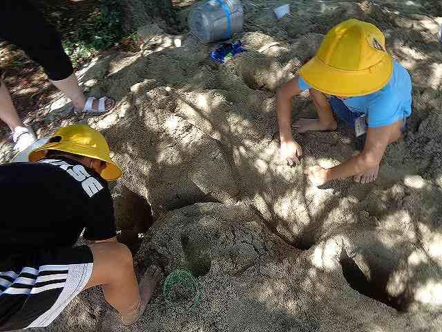 図工では、土や砂を使って友達と造形活動をしながら、土や砂の感覚を全身で味わっていました。深く掘った穴と道をつなげて水を流し、足を入れて「きもちいい~!!」と楽しんでいました。