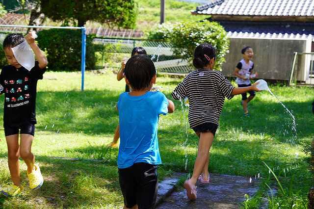 手作りの水鉄砲やマヨネーズの空き容器などを使用し、お互いに水をかけ合いながら残暑を涼しく過ごしました。