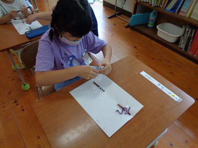 いろいろな材料や用具の操作の経験を全員にして欲しいという担任の思いから、ひらがなの練習はプリントに鉛筆で書くだけの学習ではなく、いろいろなものを使って文字の形を捉える学習も行っています。