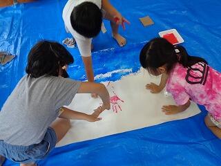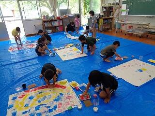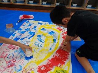 大きな紙に,絵の具でいろいろな模様をかいていきました。手に絵の具をつけて手形をつけたり,カップや段ボールに絵の具をつけていろいろな模様をかいたりしました。