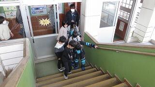 「福祉ってなんだろう?」というところから福祉の学習はスタートしました。今回は、二人一組を作り、ひとりが目隠しをして、もうひとりが手を引きながら階段等を進む、福祉体験にチャレンジしました。