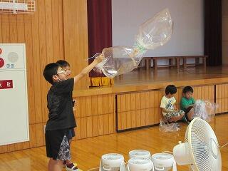3年生の図工の様子です。今回は絵を描いたりすずらんテープを貼ったりしたポリ袋を,送風機で吹き上がらせて楽しい動きを表す活動に取り組みました。