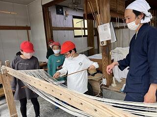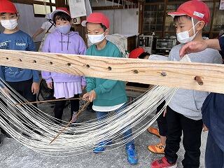 素麺を伸ばし、細くする作業を体験させてもらいました。やってみると、とても難しかったようです。一つ一つ手作業で作る大変さや素晴らしさを学びました。