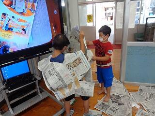 新聞紙を切ったり破ったり、貼り付けたり穴をあけたりしながら、どんなものができるのか考えました。