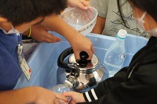 子どもたちはグループを作り、実際にペットボトルに水を入れて比べてみました。