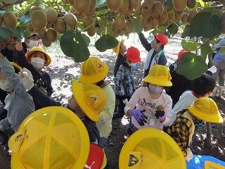 10月12日(水)、1年生となかよし・たんぽぽ学級の子どもたちは、ニューガイアアグリにキウイの収穫体験へ行きました。