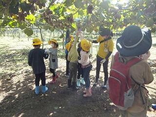 職員の方のお話を聞いて、キウイ狩りを始めました。子どもたちは手を伸ばして元気に活動していました。自然の恵みを、全身でいっぱいに感じていました。