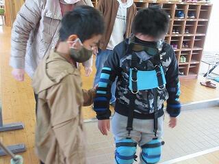 身体の動きを制限したり視界を制限したりする装具を付け、高齢者の感覚を擬似的に体験しました。