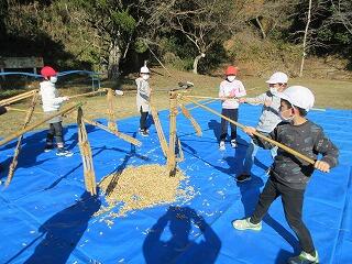 殻付きの大豆を、めぐり棒で叩きます。こうすることで、大豆の脱穀作業を進めます。