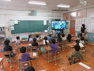 電子黒板で、給食センターでの調理の様子を見ています。南関町の子どもたちのため、調理員のみなさんが心をこめて給食を作っていることをみんなで考えました。