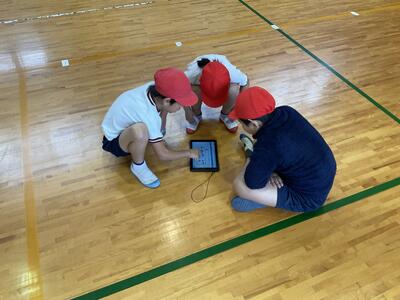 チームで準備運動,ウォーミングアップをして,ゲームを行います。タブレットの作戦ボードを使いながら作戦会議をする姿も見られ,熱心さが伝わってきます。