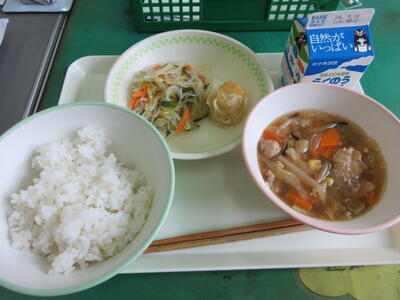 今日のメニューは、台風の影響で8月29日のメニューでした。中華丼とバンサンスー、しゅうまいの中華メニューをおいしくいただきました。給食センターは停電になったそうです。大変な中、おいしい給食をつくってくださりありがたいです。