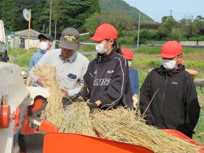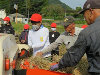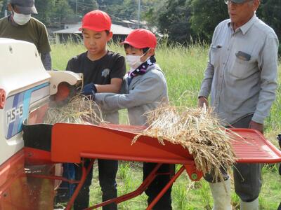 10月30日(木)、秋の深まりを感じるある日、5年生が稲作体験のしめくくりとなる「脱穀」に取り組みました。 春に田植えをしてから、地域の方々に見守られながら大切に育ててきた稲。 この日は、かけ干しして乾燥させた稲を、脱穀機を使ってお米にする作業を行いました。