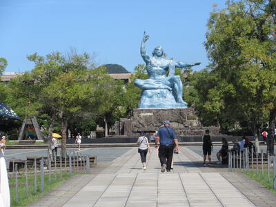6年生は10月17日(金)から長崎へ修学旅行に行きました。一日目に、長崎市の平和公園を訪れた6年生は平和集会を行いました。 この集会は、子供たちが平和への思いを高め魂を込めて練習を重ねてきました、平和への願いを込めた「平和の誓い」の発表と、福山雅治さんの「クスノキ」を平和祈念像の前で合唱しました。「クスノキ」は、長崎の被爆した楠をテーマにした曲。 子供たちのやさしく力強い歌声が、平和祈念像のある広場に広がり、その場にいた多くの方々の心にも、深い感動を与えていました。