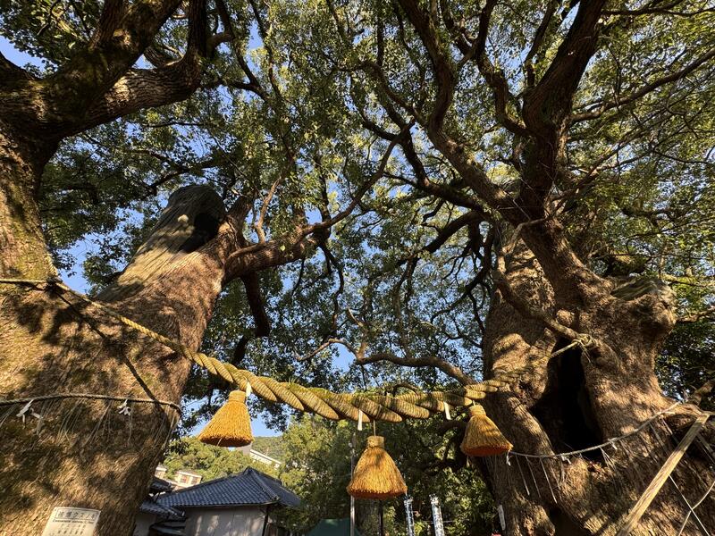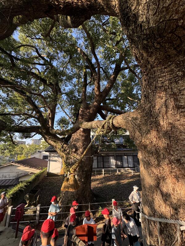 平和公園をあとにした6年生は、山王神社の被爆クスノキを訪れました。 爆心地からわずか800メートルの場所にありながら、奇跡的に生き残った2本のクスノキ。 その幹には、今もなお爆風の爪痕が残っており、戦争の記憶を静かに語りかけてくるようでした。