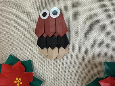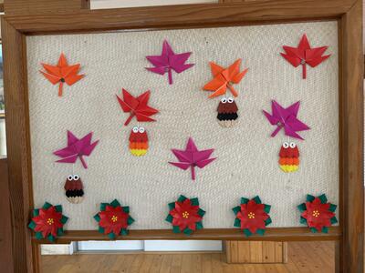 掲示板には、色とりどりの折り紙でつくられた紅葉や秋の草花が丁寧に飾られています。 赤や橙、紫に染まった葉が風に舞うように配置され、まるで秋の森を歩いているかのような、あたたかくやさしい雰囲気が感じられます。
