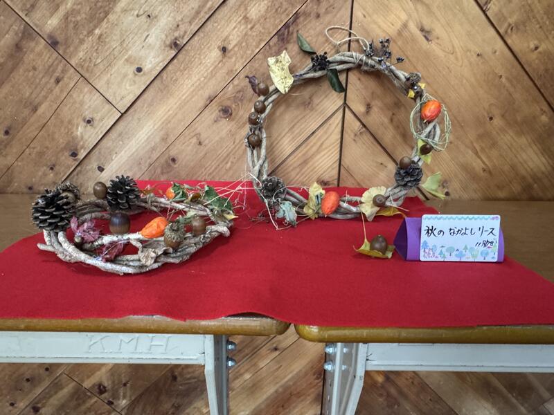 職員玄関を入ったところに秋のなかよしリースが飾ってあります。