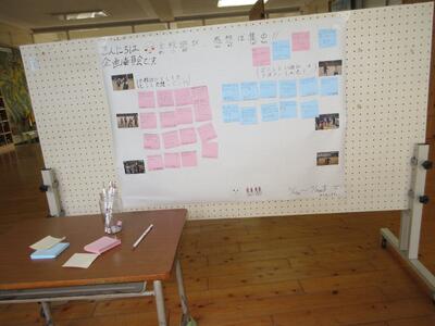 机の上にはペンとふせんが用意されていて、誰でも自由にアイデアを書き込めるようになっており、全校みんなでつくる遊びの時間になっていることが感じられます。