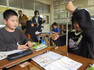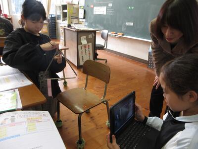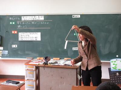 この日の小栁先生の授業では、トライアングルを使って、 子どもたちは、まず音の出し方について予想を立て、実際にトライアングルを鳴らして音の違いを確かめました。トライアングルに付箋をつけて、強くたたいたり弱くたたいたりする実験に挑戦! 音の違いだけでなく、付箋の揺れ方に注目することで、新たな気づきが生まれました。