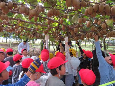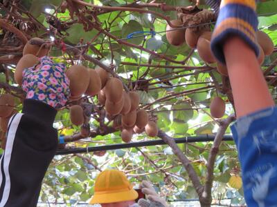 子供たちは、たわわに実ったゴールドキウイを見上げながら、大きい、おいしそうと目を輝かせて収穫に挑戦。 収穫したキウイは、しばらく追熟させることで中身が黄金色に変わり、甘くてジューシーな味わいになるそうです。子供たちは早く食べたい、おうちの人にも見せたいと、自然の恵みに心を躍らせる子供たちの姿がとても印象的でした。