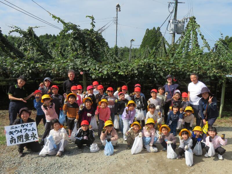 10月24日(金)、秋のやわらかな日差しの中、南関第三小学校の1・2年生が、校区内にあるニューガイアアグリ株式会社 南関豊永キウイファームを訪れ、キウイの収穫体験を行いました。この活動は、ニューガイアアグリ株式会社様二お世話になり地域の自然や産業にふれながら、食べ物の大切さや感謝の心を育むことを目的に、毎年実施されているものです。
