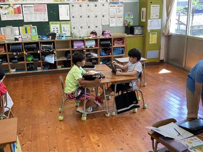 今日の国語の時間では「どうぶつえんのじゅうい」の学習をしました。じゅういの仕事と工夫について表にまとめました。発表する際には,「○○さんと似ていて」や「ちょびっと似ていて」などのつなぎ言葉を使って発表をしていまいした。子どもたちが,子どもたち自身の考えをつないで授業を進めようとしていました。