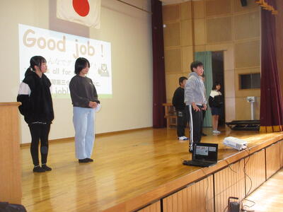 英語の歌やみんなで英語で挨拶をしました。企画委員会からの英語の3ヒントクイズも出され英語し慣れ親しみコミュニケーションを図る素晴らしい機会となりました。