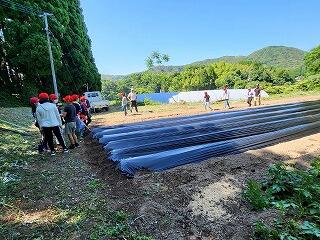 みんなで手分けして、くわでうねを作ったりマルチを張ったりしました。