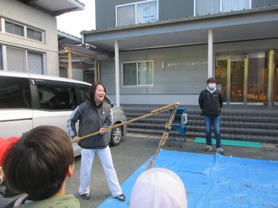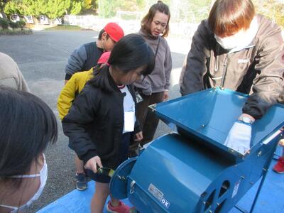 この日も、丸美屋さんから3人の方に来ていただき、子供たちが伝統的な農具くるり棒を使った脱穀体験を行いました。うまくくるりと回すのは結構難しかったです。その後機械を使った脱穀を行い、それらを使ったきなこができあがるのを楽しみにしています。