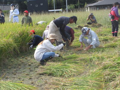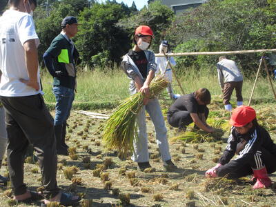 相谷区区長をはじめ区の皆様方や、婦人会の皆様方、地域学校協働活動でのボランティアの方々、保護者や南関町総務課など行政の方々など大勢の方のサポートや指南により、5年生は稲刈りを始めました。