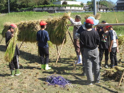 10月11日(金)、5年生は2時間目から学校横の田んぼで稲刈りを行いました。