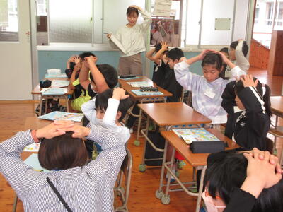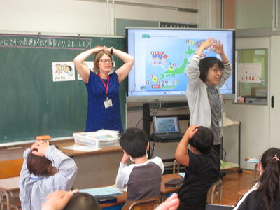 5月8日(水)、4年生はコリーン先生や英語専科の前田先生に、天気や何をするかさそう表現を学びました。