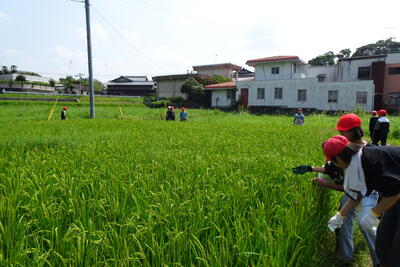 台風一過の火曜日、5年生は南関米の田んぼの草とりをしました。地域の先生方のご協力をいただき、順調に育っています。「先生!こんなに草がとれました!」「イナゴを初めて見た!」色んな声が聞こえてきました。実りの秋、目前です。