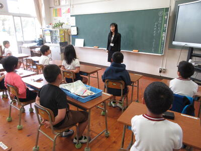 4月12日(金)、教員1年目の初任者である3年生担任の石田 あき先生の研修を行っていただく、村上仁美先生が荒尾市立中央小学校からいらっしゃいました。3年生への紹介をしました。