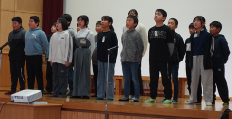 2月13日(金)に学習発表会がありました。「伝える」という目標を立て、9月から「米作り」「環境学習」「水俣病学習」の3つの班に分かれ、「劇」「ニュース」「構成詩」の3つの伝え方から選択してセリフや動きなど子供たち自身で準備を行ってきました。12分という短い発表時間の中で、1年間学んできたことをどのように伝えるか。どんな内容にするか。「伝える」ために試行錯誤を行いました。しかし、冬休みがあけた1月。歌の練習で集中できない場面が見られたり、真剣に練習できない時があったりすることもあり、1度は歌を歌わないでおこうと話し合いました。このままでは伝えたいものも伝わらないと、子供たちはもう一度「伝える」という目標に立ち返り、自主練習に励んでいきました。時には朝の時間に2回以上歌の練習を行ったこともありました。