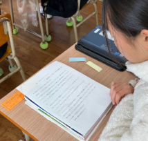 完成した意見文を一小の5年生と交換し、読み合いをしました。一小の5年生の意見文を読みながら「なるほど」「この反論に対する答えいいね」など、よいところを見つけ付箋にたくさん書き、貼りつけていきました。